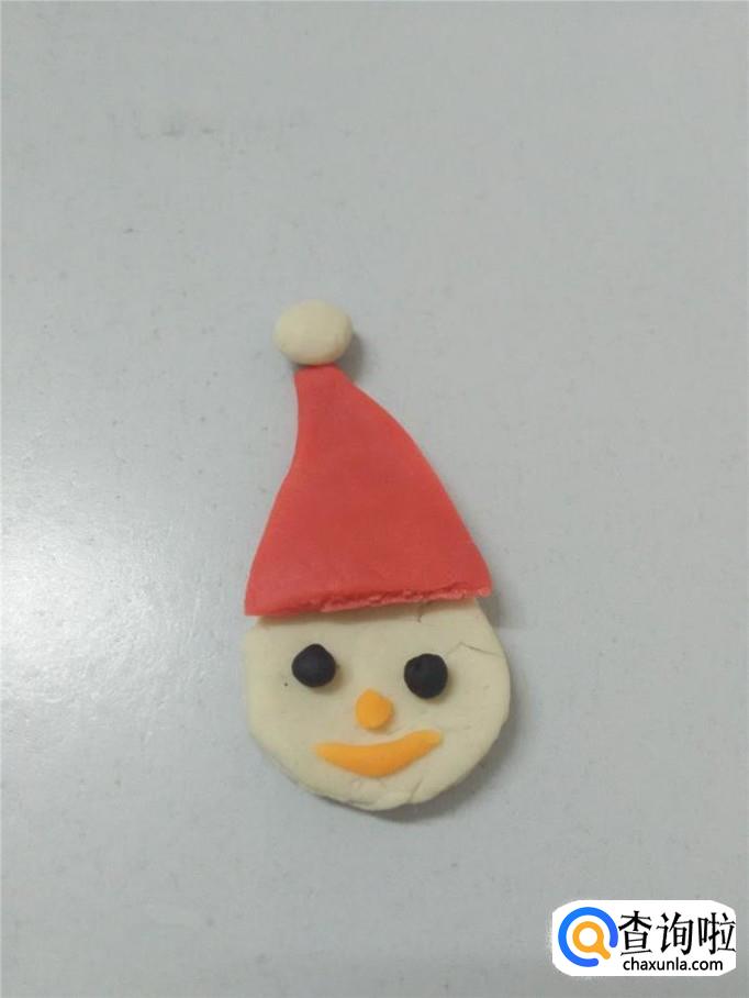 用白色团一个小球,再按成扁片,粘在雪人的帽尖上,当作圣诞帽上的白色绒球。