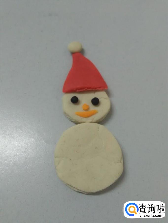用白色再捏一个大一些的圆形,粘在雪人的头部下方,当作雪人的身体。