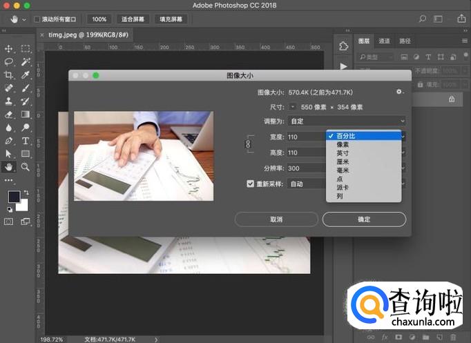在图像大小弹框中,将方式设置为“百分比”,然后点击左侧的相连符号,进行等比放大,点击“确定”