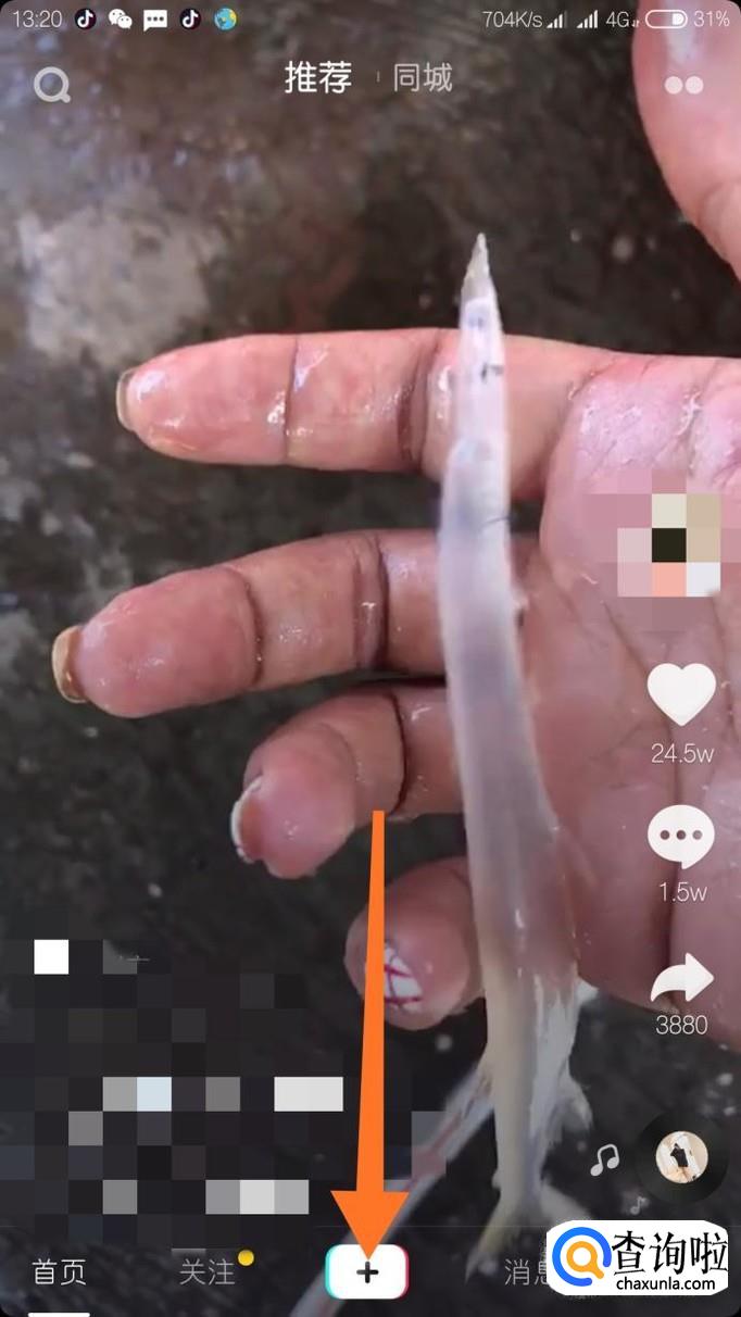 打开抖音短视频,点击屏幕下方中间的彩色加号,如图所示。