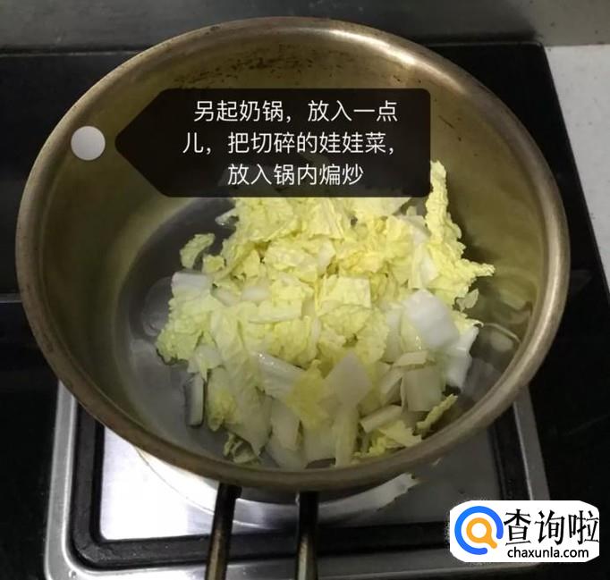 然后另起一锅,放入一点油,把切碎的娃娃菜倒入锅中煸炒三分钟,如下图所示。