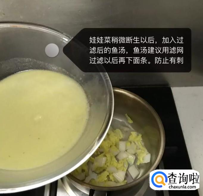 接着把鱼汤用过滤网过滤到娃娃菜所在的那个锅中,之后把面条下进去煮五分钟,如下图所示。
