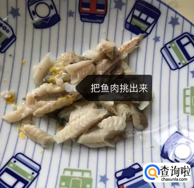 然后把鱼肉中的刺挑出来,如下图所示。