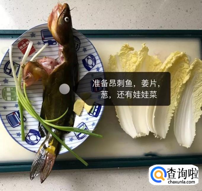 首先准备好要用到的昂刺鱼、姜片、葱还有娃娃菜,如下图所示。