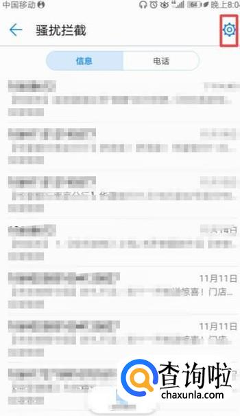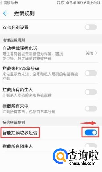 之后我们将智能拦截垃圾短信的开关向右滑动打开,这样我们就屏蔽了广告短信了。
