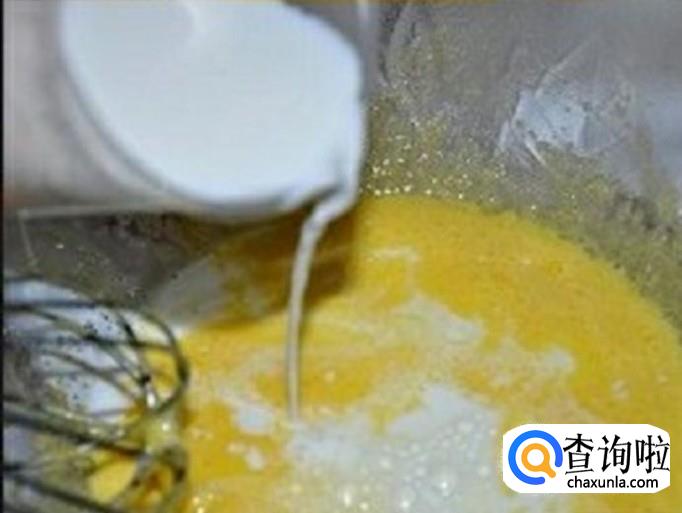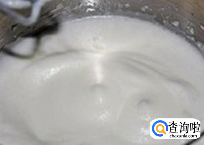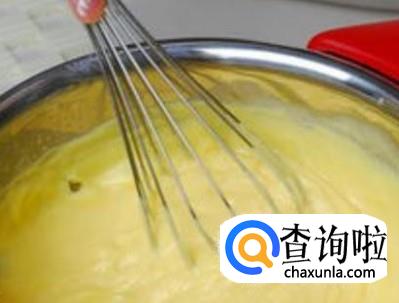 打匀之后加入色拉油,不要太多,大概一勺就可以了,然后继续使用打蛋器,知道发白为止。