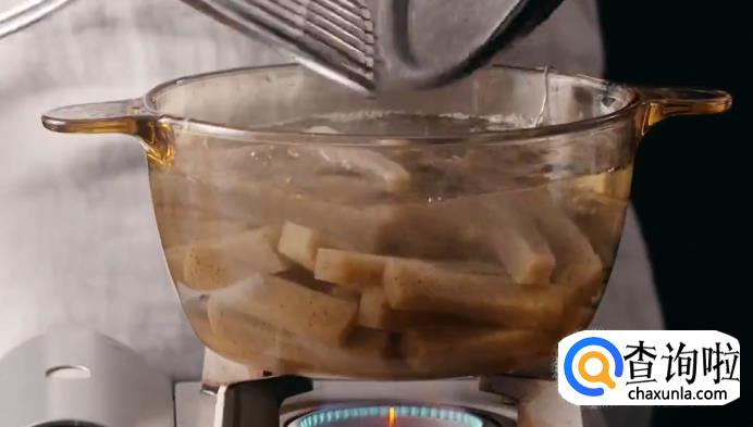 首先把魔芋焯水,先煮茶水,煮开之后再倒入切成一指宽的魔芋条,焯水后捞出,这样可以去除碱味。