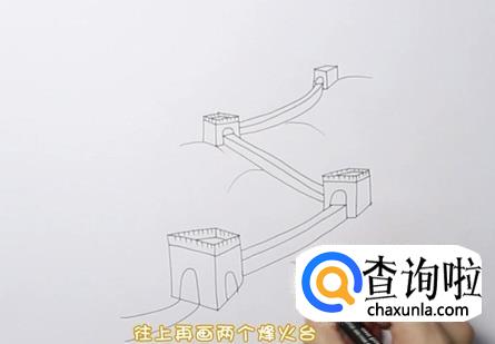 往上再画上两个越来越小的烽火台,把城墙也画出来,再用线条绘出一些山丘的轮廓。