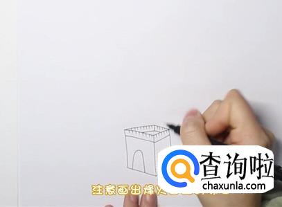 第一步先画出一个正方体作烽火台,在两侧绘出城门的轮廓,再在上面画上烽火台的垛口。