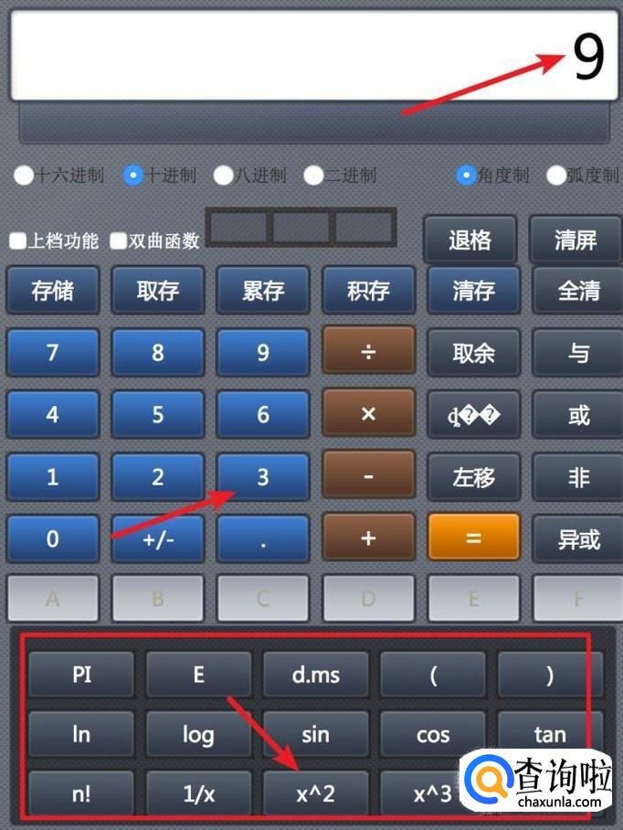 科学计算器下方是一些复杂的数学运算,比如求sin值,cos值,或平方值,以平方值为例,先按数字3,再按平方按钮,就得到结果9了。