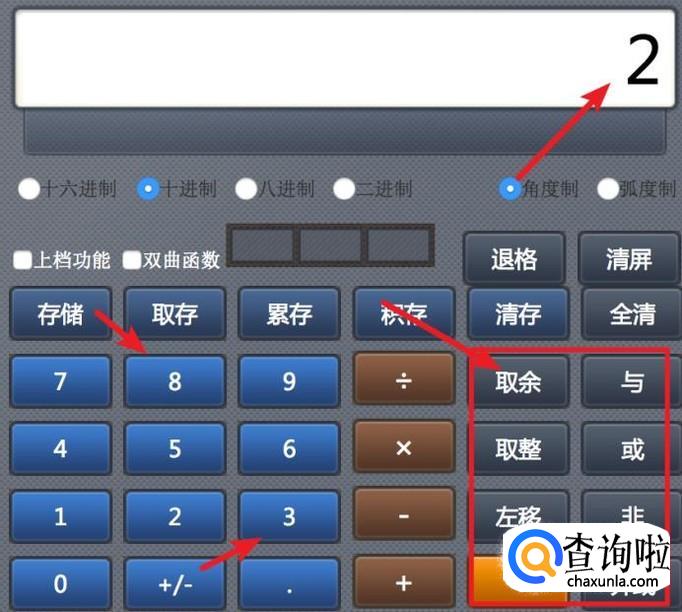 科学计算器的右边是一些逻辑运算的按钮,比如与非或,取余运算。以取余运算为例,和普通运算用法一样,先按数字,比如8,再按运算符‘取余’,最后按数字3,按=号后就得到结果2了。8除3的余数就是2了。