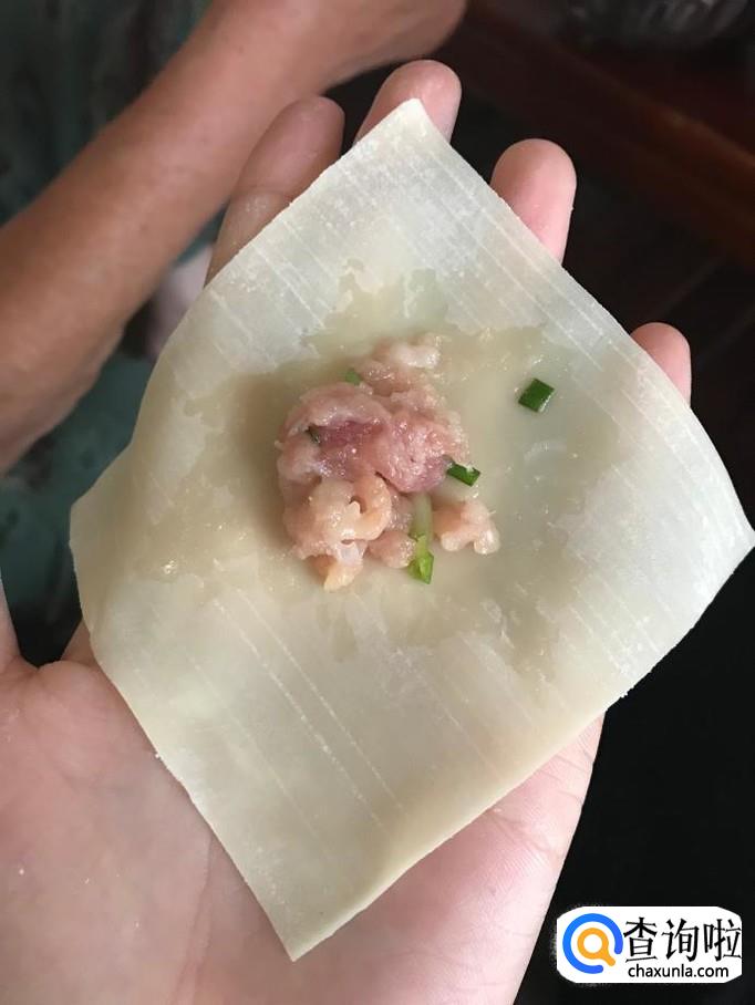 取一张抄手皮呈对角线状放置于手上,挑取适量肉馅,注意肉馅不要过多,否则可能抄手会不易煮熟,然后沿对角线对折抄手皮,使肉馅被包入其中。