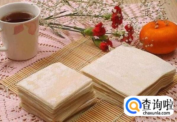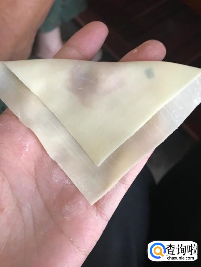 此时该半成品呈一三角形状,在三角形左边的这个角上蘸取少量事先准备好的清水以便后面抄手易于成形而不会散开。