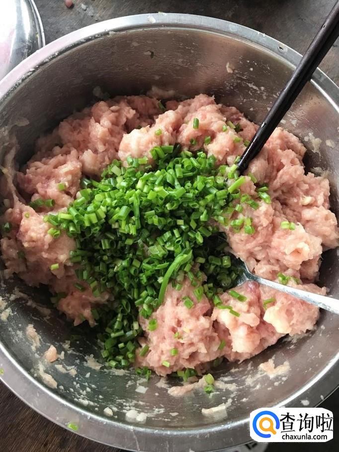 取一小勺干淀粉溶于适量水,待淀粉沉淀后,倒掉淀粉上层的水,将剩余的淀粉倒入肉馅中。加入上诉调味料后对肉馅进行充分搅拌。最后加入一把香葱,再次进行搅拌,可以有效提高肉馅的香味。