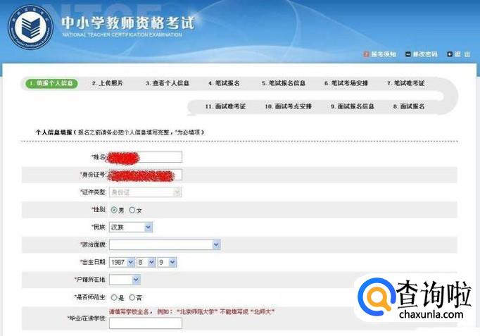 之后,正确填写自己的信息。比如所属民族,性别,政治面貌等,还要上传自己的照片。当然我们还要填写要报考的学校类别和科目,选择笔试考试地点。