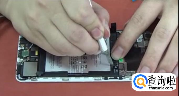 拆电池,先把电池四角的撕手位清除,拉起透明手柄,将电池去出 撕掉底部黑色胶纸