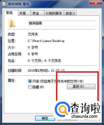 点击属性后,进入文件夹属性栏,选择高级命令点击;