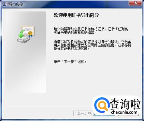 点击确定后,系统会出现一个证书导出向导对话框,点击进行下一步;