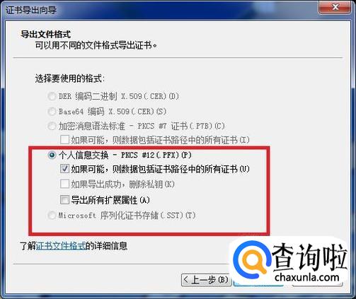在个人信息交换处勾选,如果可能,则数据包括证书路径中所以证书,继续点击下一步;