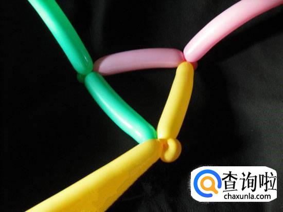 同样的方法,将第三个气球的“一脚印长”部分和其他两个气球连接固定在一起。这样3个气球构成一个圈,可以作为帽子的边缘。