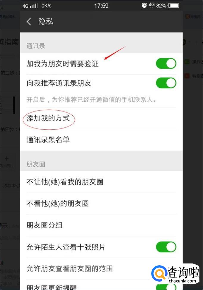 打开“加我为朋友时需要验证”开关。然后打开“添加我的方式”如图所示。