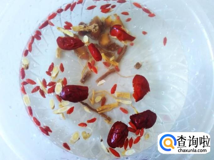 然后把全部药材放到水,把每个红枣撕成两边,泡洗干净。