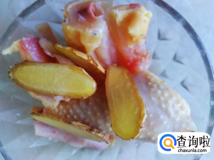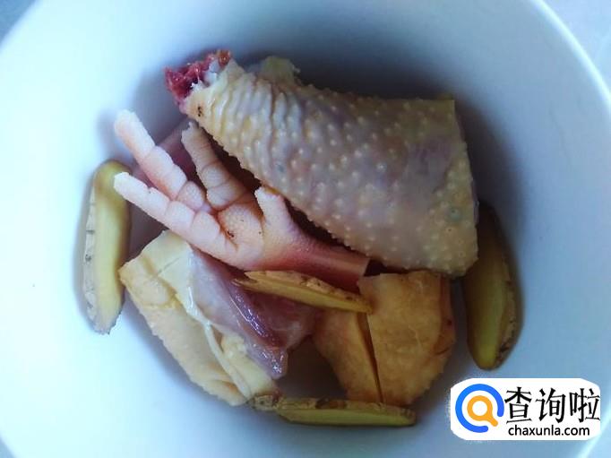 首先把鸡腿和鸡脚斩成几段,然后用盐、姜片腌制几分钟。