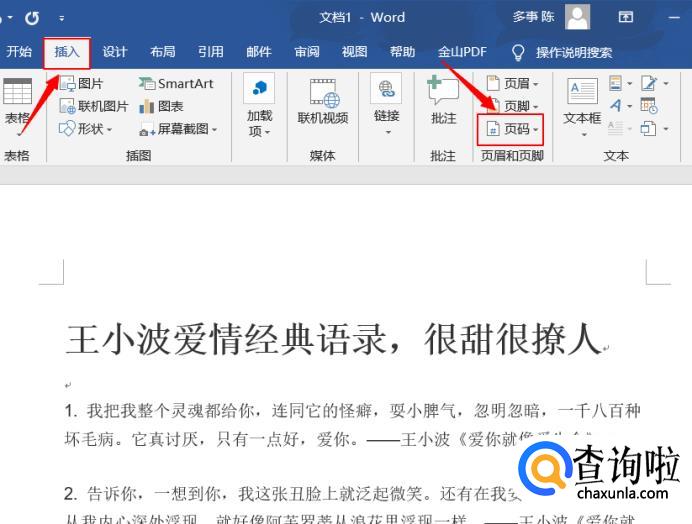 点击菜单栏中的“插入”后找到子菜单栏中的“页码”