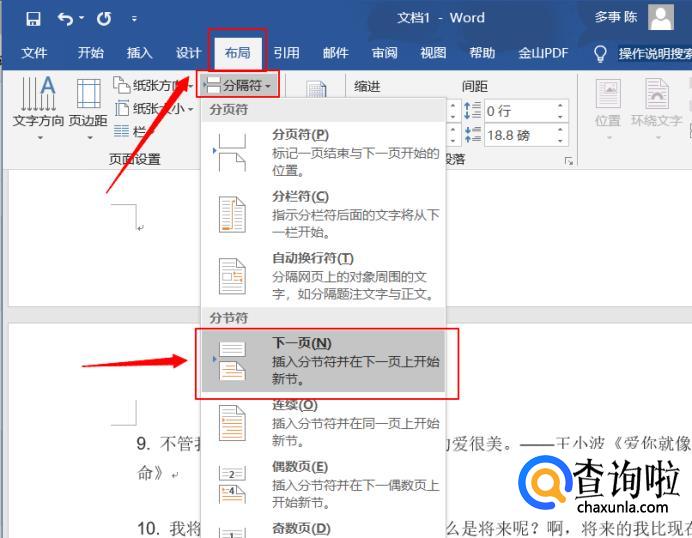 需要对某一页的页码进行重新编号,就先为文本才入分节符。即在“布局”中点击“分隔符”选择“下一页”,便完成插入