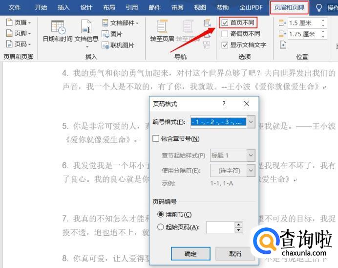 如果需要将首页的页码设计的不同于其他页码,点击“页眉与页脚”中的“页眉页脚选项”选中“首页不同”,就可以为首页添其他类型的页码。