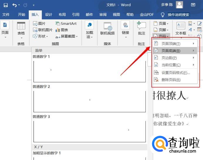 在下拉的菜单栏中选择想要的页码标注方式,如,页眉中间、页尾左侧等
