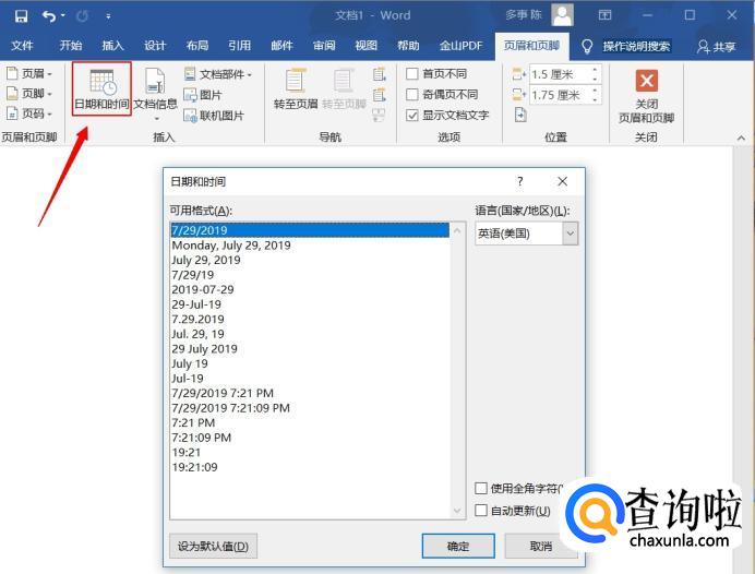 在“页眉和页脚”的菜单栏中的“时间和日期”一项,可以对为页脚添加时间,并更改格式