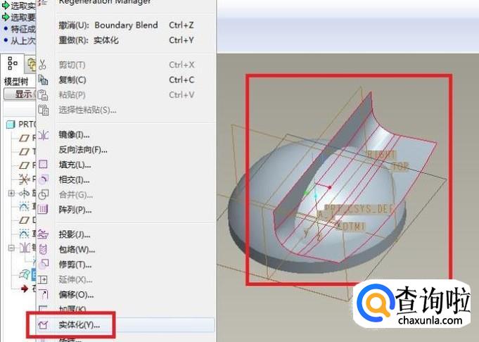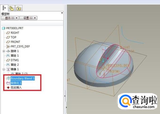 然后在设计树中将“实体化1”和“边界混合(Boundary Blend1)”两个特征都选中。