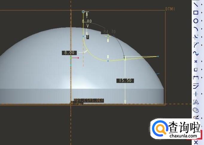 13、草绘区域以两条竖直线段的上端点为圆弧起始、终止点画圆弧,圆心在纵向中心线上,