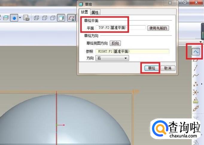 然后软件弹出一个“草绘”对话框,