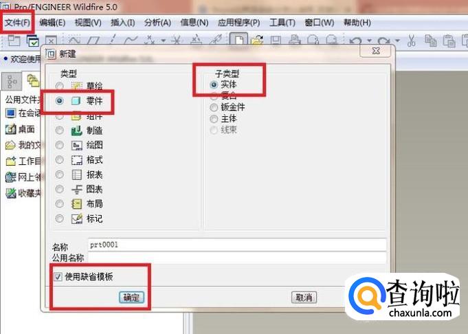 3、在随之弹出的“新建”对话框中设置:类型为零件,子类型为实体零件,勾选“使用缺省模板”,