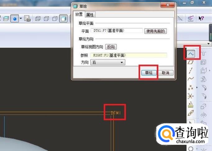 然后出现的“草绘”对话框就默认草绘平面为“DTM1”,