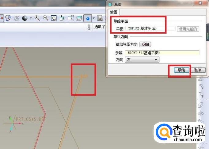 草绘平面一栏选择“TOP面”,
