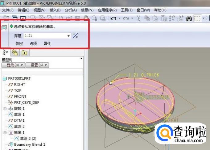3、默认的抽壳厚度:1.21,笔者看着可行,就不改动它了,