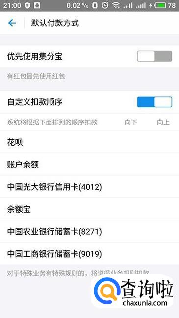 进入扣款顺序界面,在下方各种付款方式中将花呗选中,然后移动到最上方即可。