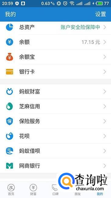 进入支付宝界面,在下方选择“我的”,然后点击“设置”
