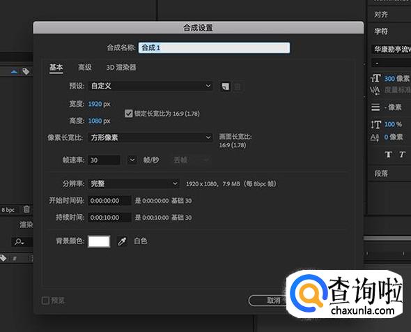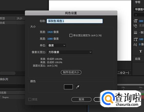 在纯色固态层设置面板,保证宽度以及高度和合成的高宽是一致的。