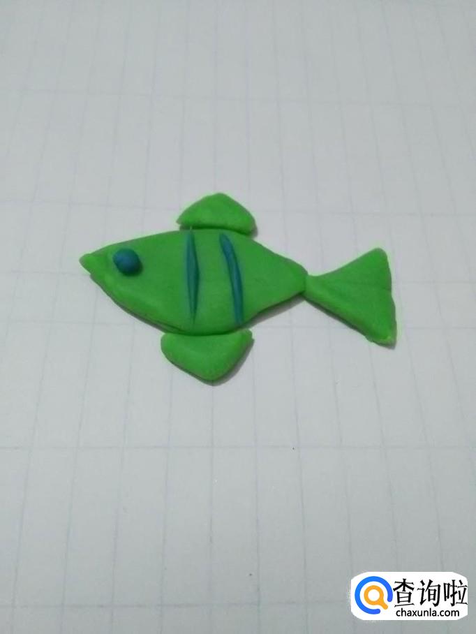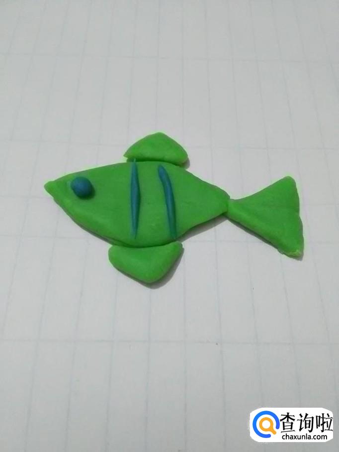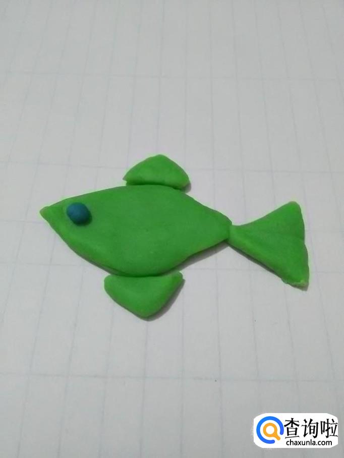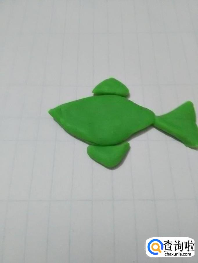 再用两块绿色橡皮泥捏成三角形,分别粘在小鱼身体上下两端,当作背鳍和腹鳍。