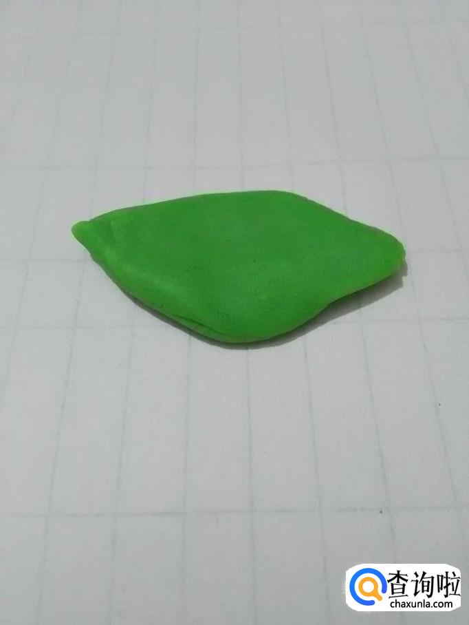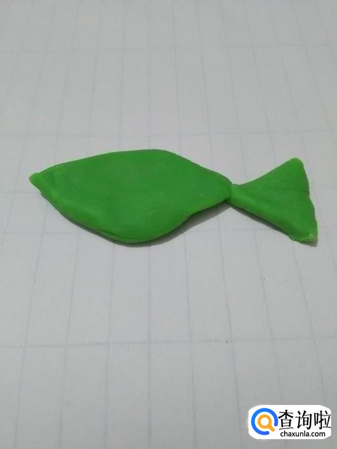 先将一块绿色橡皮泥捏成一片叶子的形状,当作小鱼的身体。