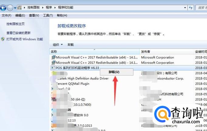 在下面的列表里找到打印机的驱动,然后选中它右键点击卸载,如下图。