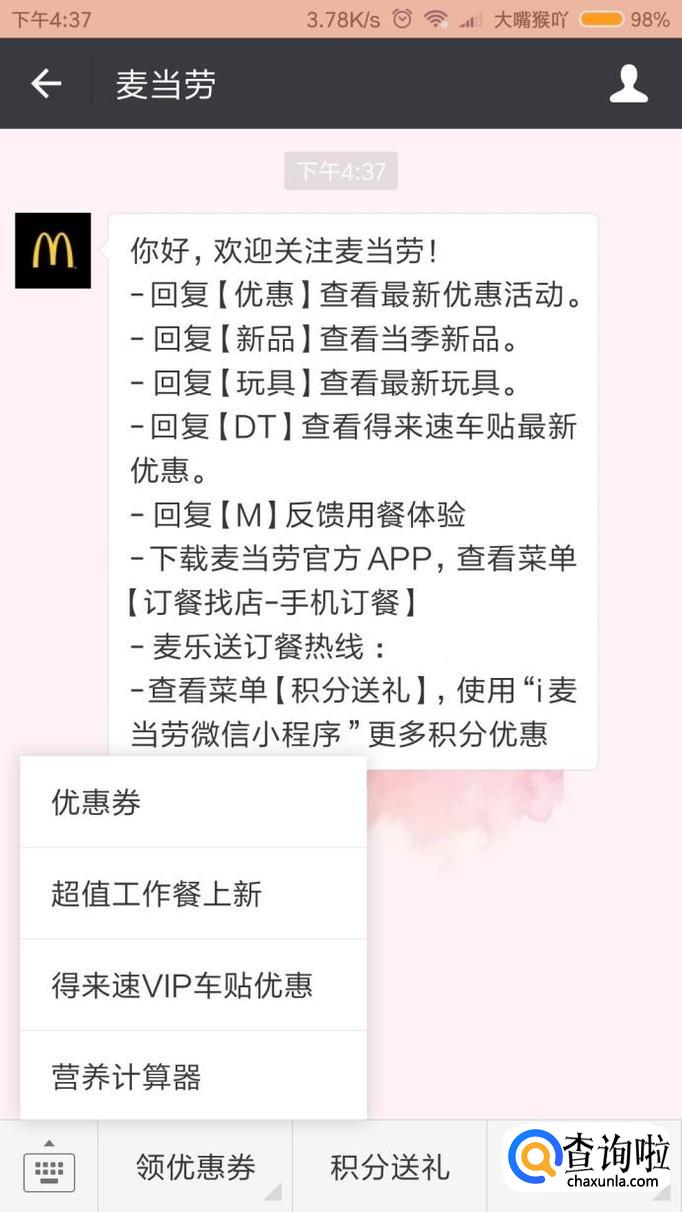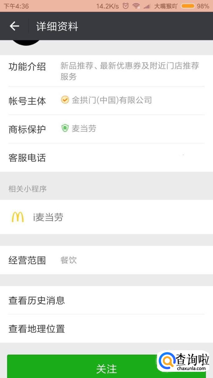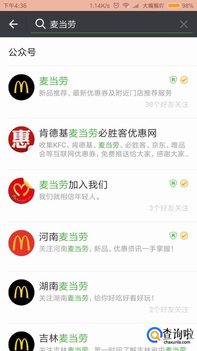 第一步你需要打开手机微信添加朋友找到麦当劳微信公众号。