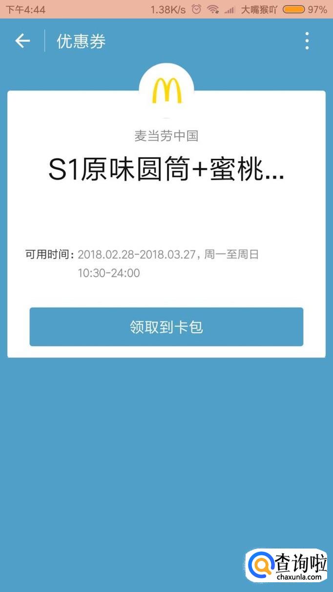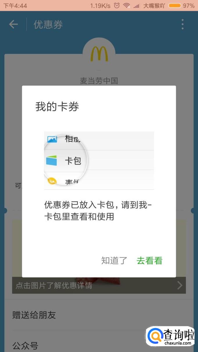 之后优惠券自动放入你的卡包,点击知道了选项。
