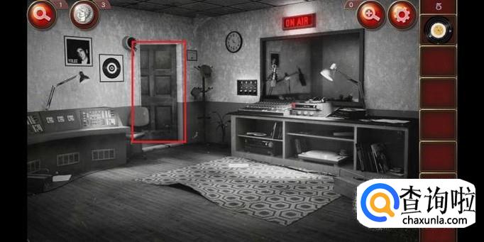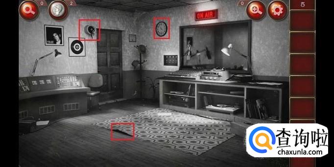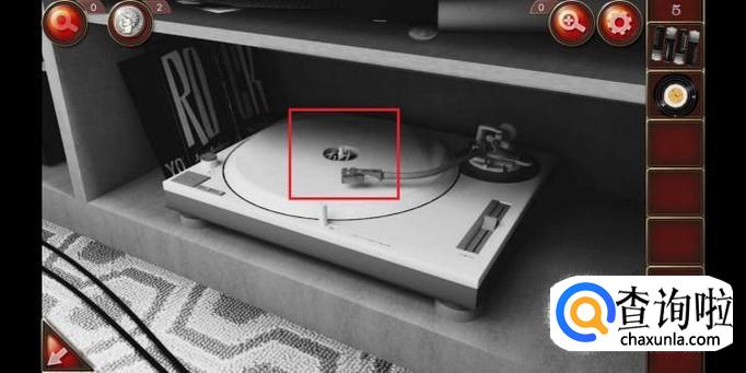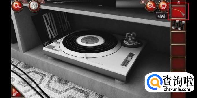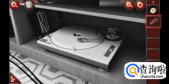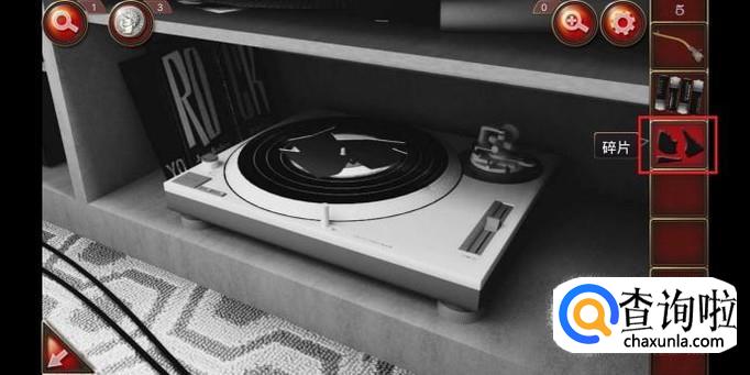 椅子修复完成后,分别在地毯下、墙上的钟表以及门顶处,分别获得唱针、电池以及唱片碎片三样物品,如图所示