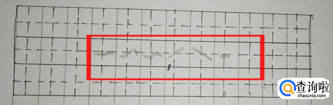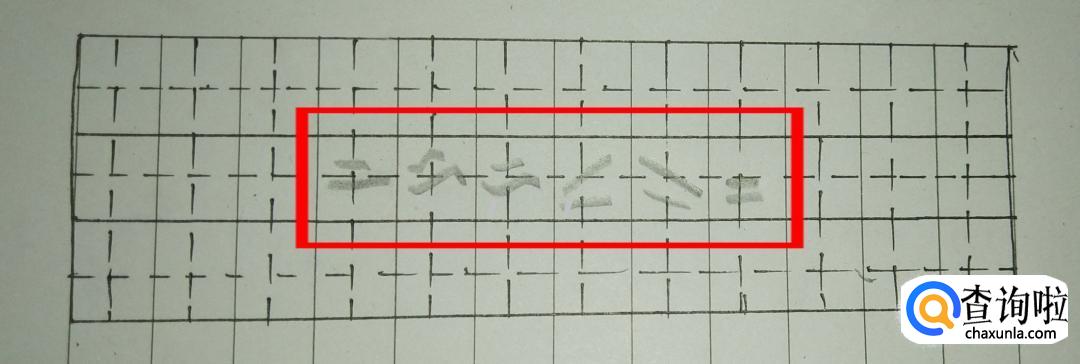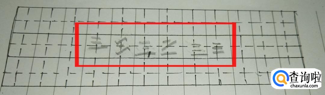 第一个字太直且没有停顿点。第二个写得过于刻意。第三个长横倾斜度太大。第四个长横太弯曲。第五个横与横之间距离太远,尽量写在格子中间位置。第六个横笔距离不等。