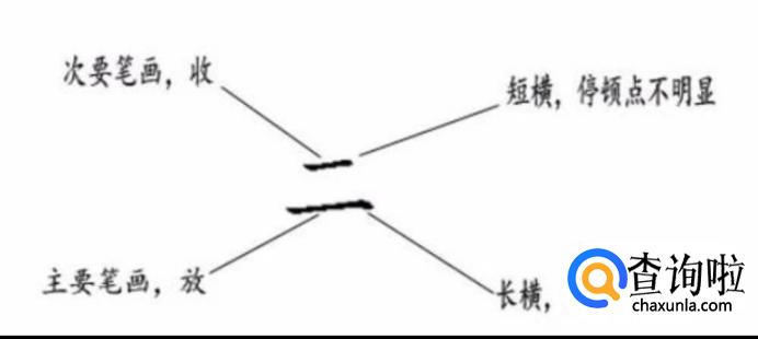 两条横线,上面的那横为短横,不可写的太长。下面的横为长横,是这个字的主力股,应该写的大方。两横之间需要合理安排宽度。